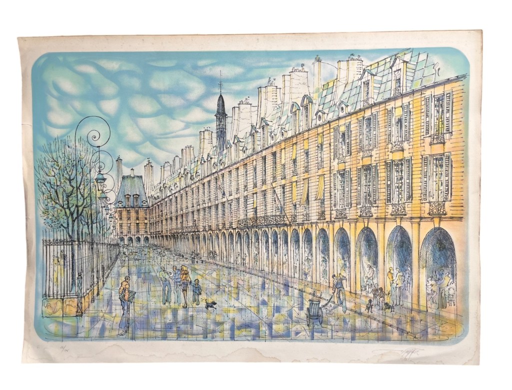 Une lithographie originale figurant une scène animée de la Place des Vosges à Paris, signée Rolf Rafflewski (1943-2019) en bas à droite, numérotée en bas à gauche 23/178 – Période : 1960 – Dimensions : à vue 56 x 76 cm, encadré 60 x 80 cm
