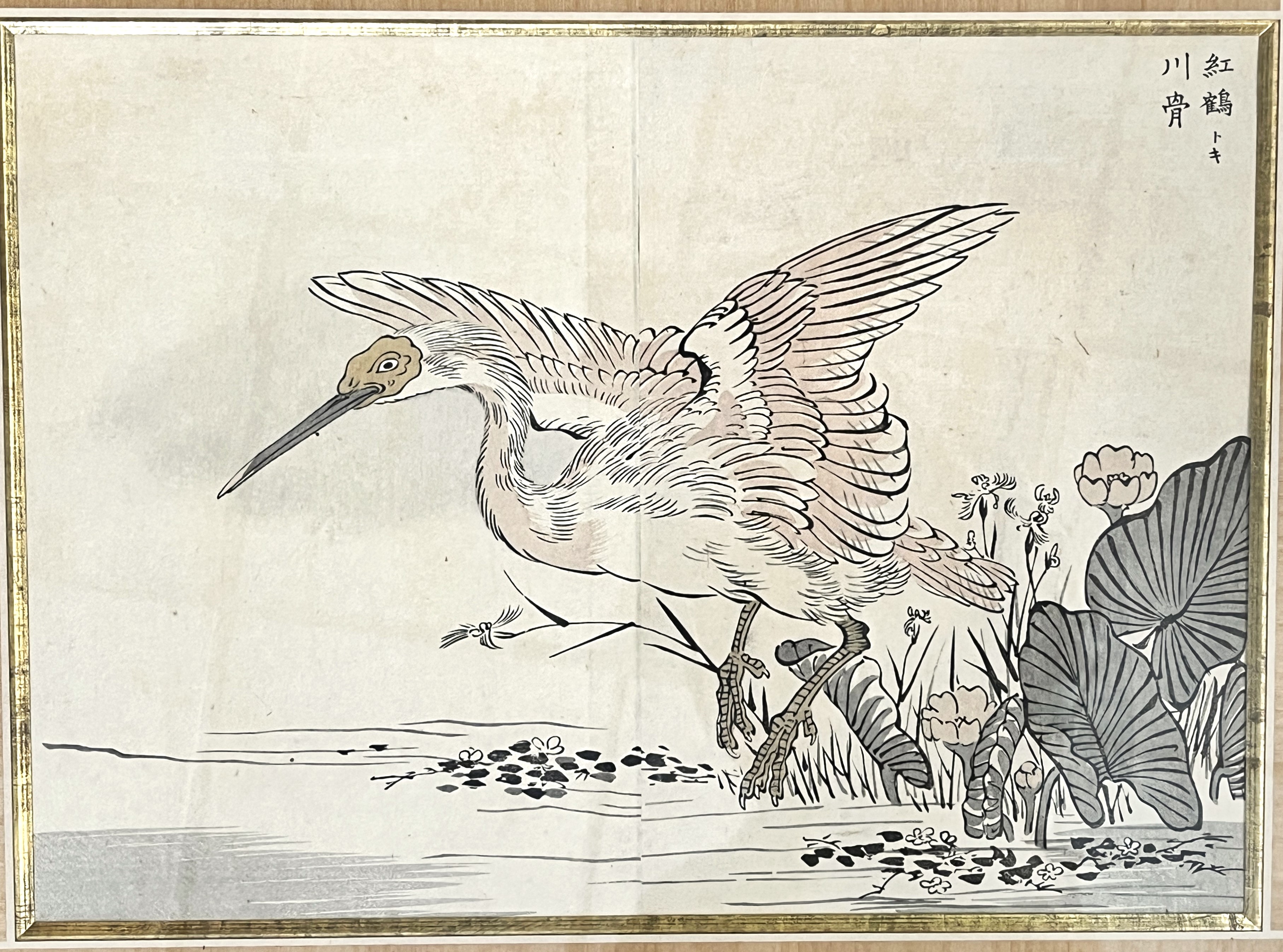 Akatsuru toki kawakotsu, grue rouge prenant son envol d’un étang de lotus