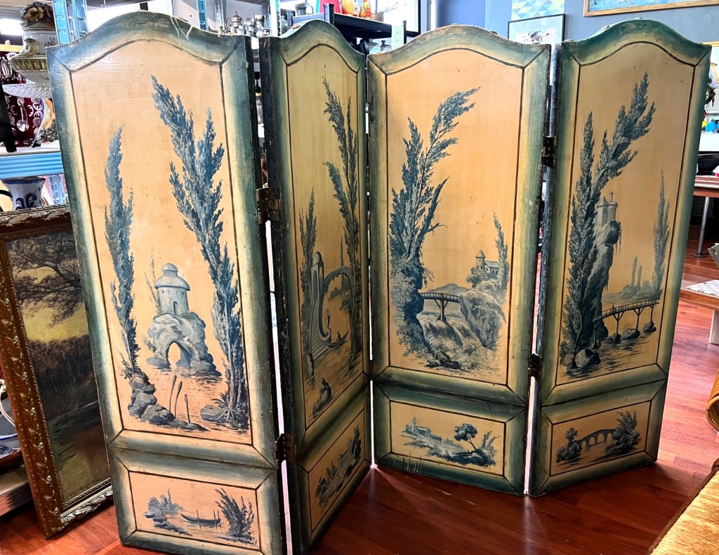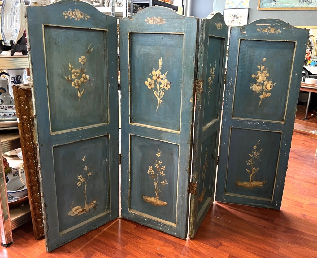 Un paravent 4 feuilles en bois peint dans le style italien du XVIIIème (travail du début XXème)