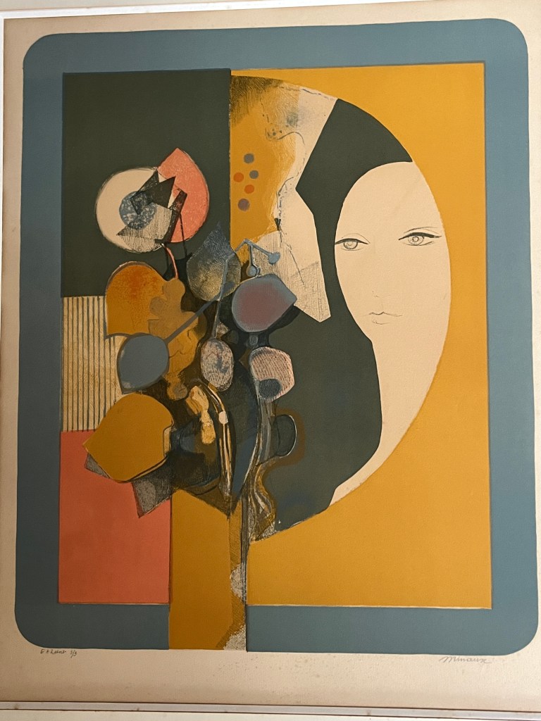 Lithographie de André Minaux, vers 1970, épreuve d’artiste 3/3 . André Minaux (1923-1986), peintre, sculpteur, illustrateur, graveur et lithographe français. En 1948 il découvre l’atelier de Fernand Mourlot (imprimeur notamment des œuvres de Picasso) et les débuts de sa carrière de lithographe.