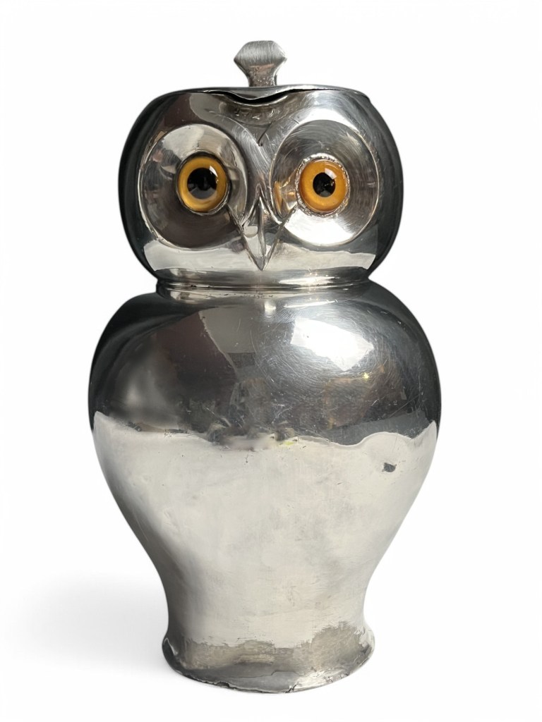 Rare, un pichet en forme de hibou avec des yeux en pâte de verre, en étain poli brillant, l’anse recouverte d’osier. Marqué sous la base : H.J. LINTON 30 rue Feydeau Paris, fabriqué en Angleterre. Période : vers 1900.