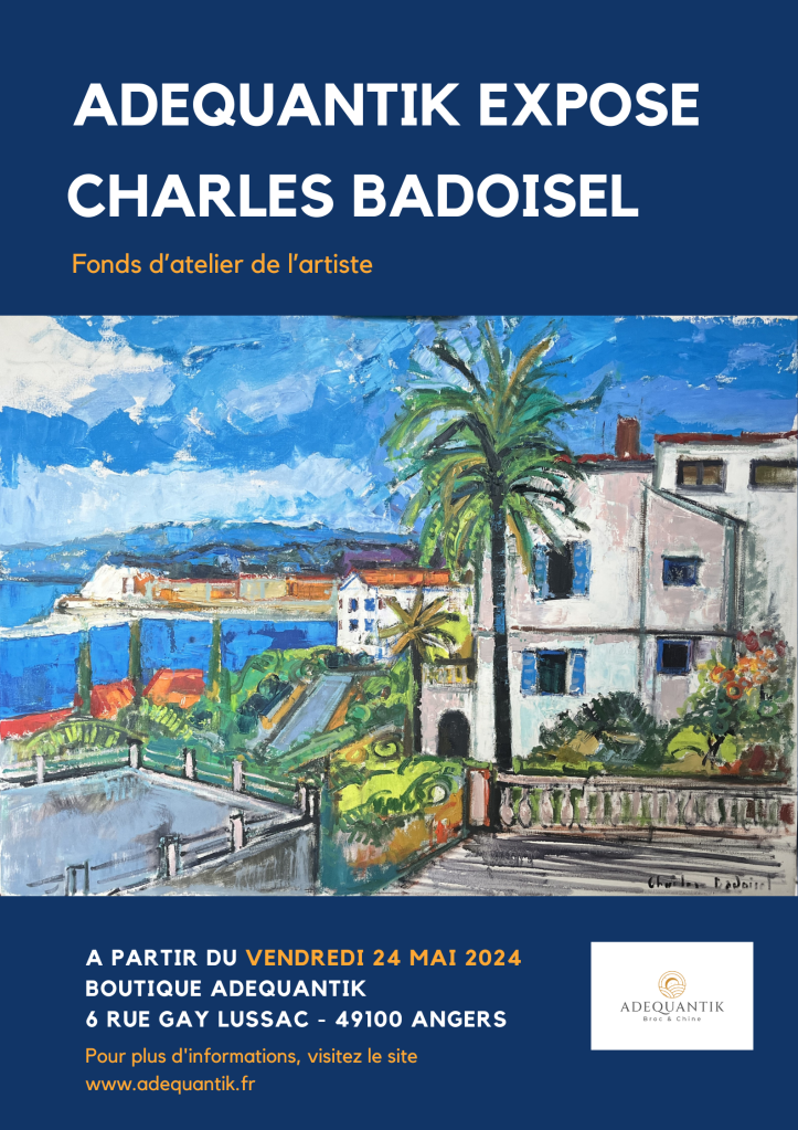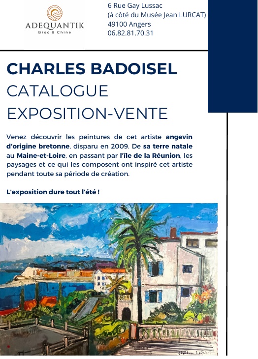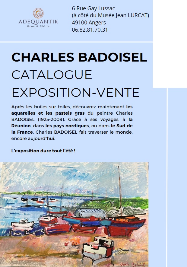 A partir du 24 mai 2024 et pendant tout l’été (du mardi au dimanche de 14h30 à 18h30), la boutique Adequantik expose une cinquantaine d’œuvres du peintre angevin Charles Badoisel (1925-2009), aquarelles et huiles sur toile, dont un tableau monumental (150 x 150 cm) sur le thème du cirque. Amis angevins, n’hésitez pas à venir redécouvrir ce peintre qui n’a plus fait l’objet d’exposition depuis une quinzaine d’années; pour les amateurs plus éloignés, voici une vidéo de présentation des HST en expo-vente. Bonne visite virtuelle (cliquez sur l’image ci-dessous 😉