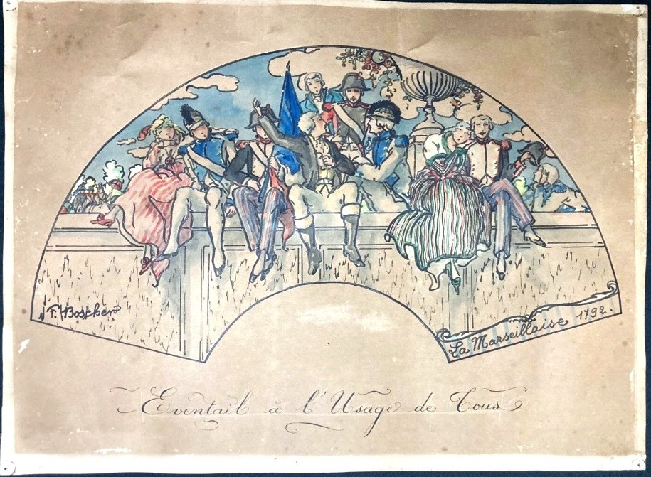 Clin d’œil pour le 14 juillet, un projet d’éventail à l’aquarelle « La Marseillaise », réalisé par Jean-Édouard Ferdinand BOSCHER (1888 – ?), artiste peintre et illustrateur français. Particulièrement actif dans les années 1920/1930, il illustre notamment diverses revues, programmes de théâtre, et publicités pour Houbigant (célèbre parfumeur connu des amateurs d’éventails). Il représente souvent des personnages en atours du XVIIIème siècle.