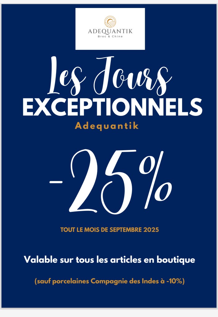 Chez Adequantik, on chine de la belle vaisselle, des céramiques, des estampes japonaises, du cristal, des serre-livres art déco, des boîtes publicitaires, des pichets barbotines, des tableaux anciens, des lampes… Il y en a pour tous les goûts et tous les budgets 🤩 Il y en a aussi beaucoup !! On n’a presque plus de place pour accueillir des nouveautés 🙃 Aussi, à partir de dimanche 31 août 2025, opération déstockage ! Pendant tout septembre, des réductions uniquement en boutique : -10% sur la porcelaine Compagnie des Indes XVIIIème et les estampes japonaises, et -25% sur le reste.